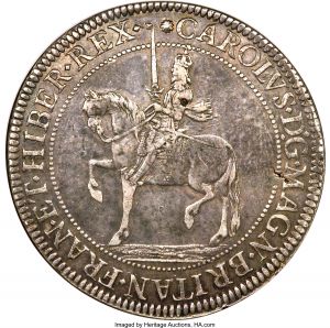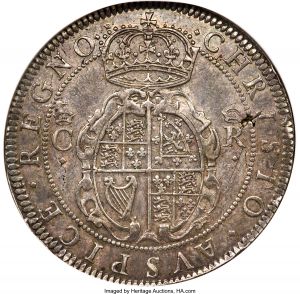 This specimen was lot 31074 in Heritage sale 3073 (Chicago, April 2019), where it sold for $10,200. The catalog description[1] noted, "Charles I (1625-1649) Crown (1631-1632) XF40 NGC, Briot's first milled coinage. Britain's first milled Crown, a huge leap in quality from any which had preceded it and highly appealing thus. Briot's abilities as an engraver and medallist were not being appreciated in his native France, and so he applied his talents to the coinage and medals of Charles I, generating such masterpieces as this elegantly engraved and superbly produced Crown. Clearly he had not perfected the process; this piece shows a couple of planchet issues, with minor cracks to both sides. However, the quality is undeniably impressive with full, bold legends, a round flan and a perfectly even application of detail (all attributes which collectors will know are lacking from Charles I's hammered coinage). This piece shows even wear to both sides, but this has disguised little of the original detail and in most regards remains bold and appealing." Nicholas Briot (1579-1646) was an engraver and medallist. He failed in his efforts to persuade French mint authorities to adopt modern milling machinery and so moved to London, where he was hired by Charles I. He produced a series of milled coins in the early 1630's (including the crown shown here) and was sent by the king to Scotland to reform the mint there. He later served with the royalists in the Civil War and retired to France at the conclusion of that conflict. Hammered coinage continued in France until the 1650's and in England until 1664.