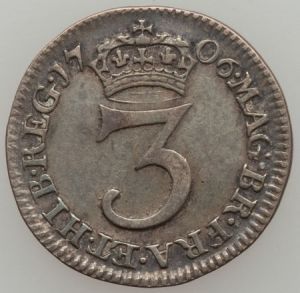 This specimen was part of lot 27639 in Heritage sale 3022 (New York, January 2013), which sold for $558.13. The catalog description[1] noted, "Anne to George II silver coins, various types, average grade VF and toned." The threepence was struck for queen Anne 1703-13 in sufficient numbers that it is fairly common today. It would survive as a silver coin into the reign of George V and is still struck in silver for the Maundy sets.