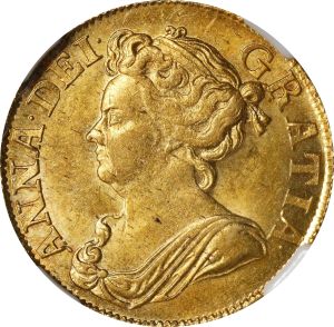 This specimen was lot 32067 in Stack's Bowers ANA sale (Chicago, August 2022), where it sold for $14,400. The catalog description[1] noted, "GREAT BRITAIN. Guinea, 1711. London Mint. Anne. NGC MS-61. Across both PCGS and NGC, there have only been two examples of the 1711 Guinea certified as Mint State, both NGC MS-61 certified examples. The luster on this beauty is entrancing, and there can be no doubt as to its originality. The strike is good, though not entirely full, and there is a touch of marking. Some adjustment marks are noticed on the reverse, likely leading to the grade assigned. Despite this, it appears that a better example is not forthcoming, leaving this stunner as the zenith of the date. For the British milled collector, this piece stands a preeminent beauty worthy of the most advanced of numismatic cabinets. From the Augustana Collection." This type was struck in small numbers 1709-14 and all dates are rare today, especially in nice condition. The catalog also records similar two and five guinea gold pieces. Unlike gold issues of the next century, which usually remained in bank vaults, these coins circulated extensively.