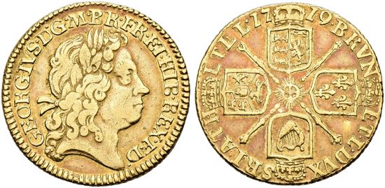 The guinea of 21 shillings was the standard British gold coin during the eighteenth century and was issued in large numbers. Most were exported to pay soldiers and provide "subsidies" for friendly rulers. This type, struck 1715-24, is the first minted during the reign of George I, the first of the Hanoverians. An "elephant and castle" variety exists for 1721 but is extremely rare.