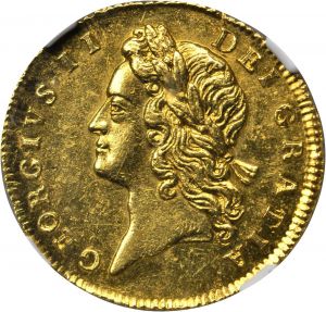 This specimen was lot 20463 in Stack's Bowers ANA Auction (Denver, CO, August 2017), where it sold for $4,700. The catalog description[1] noted, "GREAT BRITAIN. 1/2 Guinea, 1731. George II (1727-60). NGC MS-63. Sharply struck with good definition of the fine details visible without the aid of magnification, lustrous and very attractive. A lovely example of a popular series." This type, struck 1728-39, is priced about the same as the accompanying guinea, suggesting that it is considerably scarcer. A rare variety exists (KM 565.2) with "E.I.C." below the bust, indicating gold from the East India Company.