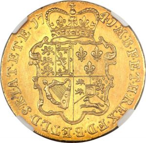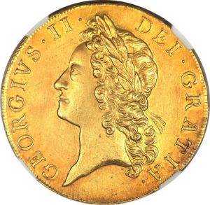 "A Beautiful George II 5-Guineas Piece George II gold 5 Guineas 1741, Young Laureate Bust, garnish on the crown altered from the previous type, DECIMO QVARTO edge, MS62 NGC, a really lovely and, in reality, a decidedly Choice UNC 'fiver' blessed with a truly exceptional strike and most pleasing deep gold toning over satiny luster. The king's portrait and the large crowned shield, as well as all lettering and the digits of the date, are bold in all details. The luster glows with a satiny blush, and the fields are slightly 'dished,' imparting great eye-appeal to this excellent coin. Date appears to be recut 4/3, not noted on grading insert. Five Guineas have at times sold for prices far exceeding SCBC values or auction estimates, and sometimes they have been a bit soft, depending on external circumstances, but a coin like this -- the most impressive in size and the most intrinsically valuable of English gold issues -- should excite many bidders worldwide, and the state of the economy should in truth matter comparatively little when serious collectors are presented with an opportunity such as this to obtain a coin of exceptional quality. Rare so fine."