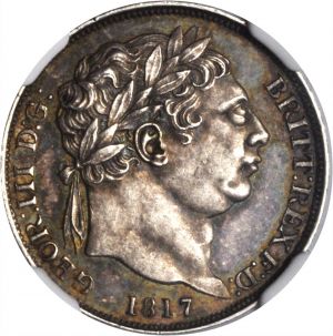 This specimen was lot 40347 in Stack's Bowers NYINC sale (New York, January 2019), where it sold for $1,320. The catalog description[1] noted, "GREAT BRITAIN. 6 Pence, 1817. NGC PROOF-63. Plain edge. Impressively bold through the designs with high rims and watery reflectivity in the fields that confirm presentation quality. Old tone, comprised of a mixture of rich rainbow hues, contributes even more to the highly charming appearance. RARE and highly coveted in this Proof format." The type was struck 1816-20 and features the bust of George III, by then subject to the regency of his son the Prince of Wales.