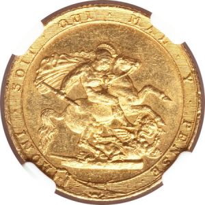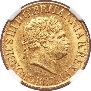 This specimen was lot 24060 in Heritage sale 3020 (Long Beach, September 2012), where it sold for $3,055. The catalog description[1] noted, "George III gold Sovereign 1817, MS62 NGC, lustrous, a number of abrasions in the soft metal." This type was struck for George III 1817-20 and despite substantial mintages, all the dates are scarce in nice condition.