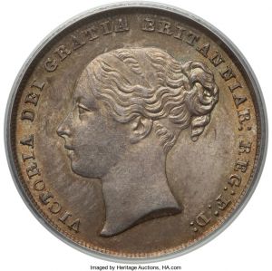 This specimen was lot 33078 in Heritage sale 3073 (Chicago, April 2019), where it sold for $384. The catalog description[1] noted, "Victoria Shilling 1846 MS64 PCGS. Evincing rather clean surfaces toned to a delightful array of rainbow hues. From the Lake County Collection." This type was struck 1838-66 in large quantities with a slightly modified obverse continuing until 1887. This is a fairly common date.