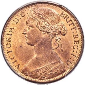 This specimen was lot 33330 in Heritage sale 3049 (Long Beach, September 2016), where it sold for $705. The catalog description[1] noted, "Victoria Penny 1866 MS65 Red and Brown PCGS. Bun Head type. With an overall enchanting appearance." This type was struck 1860-74 at London and Heaton with a slightly modified obverse extending to 1894.