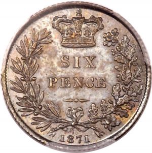 This specimen was lot 24314 in Heritage sale 3024 (Chicago, April 2013), where it sold for $705. The catalog description[1] noted, "Victoria Sixpence 1871, Young Head, Die #15, MS66 PCGS, technically just about all anyone could want in a tanner of this type, boldly detailed with luster showing strongly under lovely silvery bluish gray toning. One of the nicest ever seen. From The Kairos Collection." This type was struck 1838-66 in large quantities with a slightly modified obverse continuing until 1887.