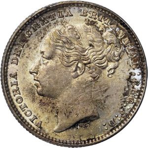 This specimen was lot 30701 in Heritage sale 3029 (New York, January 2014), where it sold for $440.63. The catalog description[1] noted, "Victoria Shilling 1879, Young Head, MS63 NGC. A delightful example of the shilling of this year, without die number. Unusually sharp in strike, this coin is brightly lustrous beneath rich golden blue iridescent toning." This type was struck 1879-87 as the final issue of the young head type first struck in 1838. This date is common but a few come with die numbers (KM 734.2).