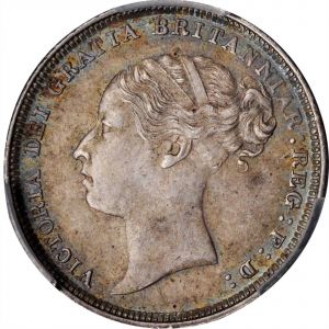 This specimen was lot 71432 in Stack's Bowers Collector's Choice sale (Costa Mesa, CA, June 2021), where it sold for $132. The catalog description[1] noted, "GREAT BRITAIN. 6 Pence, 1883. London Mint. Victoria. PCGS MS-63+ Gold Shield. A nicely struck and attractive coin with wholly original fields and rich toning." This sixpence, roughly equal to a dime, was struck 1838-87 and is common in all grades altho choice specimens are expensive. The bust was slightly modified in 1880.