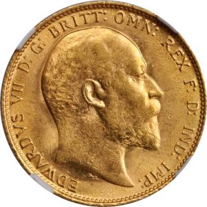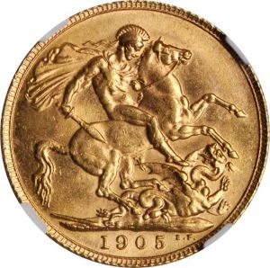 This specimen was lot 20418 in Ponterio sale 176 (Chicago, August 2013), where it sold for $1,998. The catalog description[1] noted, "GREAT BRITAIN. Edward VII, 1901-1910. Sovereign, 1905. NGC MS-63. Bare head right. Rv. Pistrucci’s St. George and the Dragon, date below. An example that is blazing, fresh, and perfect for the type. Ex: Windsor, 1971." This type was struck 1902-10 in considerable numbers and is the only sovereign for Edward VII.