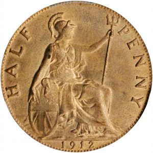 This specimen was lot 44708 in Stack's Bowers ANA sale (Costa Mesa, CA, August 2021), where it did not sell. The catalog description[1] noted, "GREAT BRITAIN. 1/2 Penny, 1912. London Mint. PCGS MS-64 Red Brown Gold Shield. A lustrous and bright coin, with full mint red in the fields." This half penny was introduced on the accession of George V in 1911 and retained the Britannia reverse first used in 1860. Persistent striking problems caused modifications to the bust in 1925 and again in 1928 tho all the circulating denominations were similarly afflicted. This is a common date.