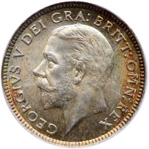 This specimen was lot 2168 in Goldberg sale 106 (Los Angeles, September 2018), where it sold for $120. The catalog description[1] noted, "Great Britain. Sixpence, 1926. George V. Modified effigy. PCGS graded MS-66." This type was struck 1926-27 in substantial numbers. It superseded a very similar type (KM 815a.2) with a slightly different bust of the king which had posed problems in obtaining a full strike. The reverse was redesigned in 1928.