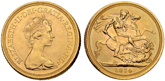 "Grossbritannien, konigreich, Elizabeth II. 1952-. Sovereign 1974. Fehlprägung: Unvollständige Randprägung. Zu Fr-418. Äusserst selten. FDC. (kingdom of Great Britain, Elizabeth II, since 1952, sovereign of 1974, Extremely rare, Uncirculated.)"