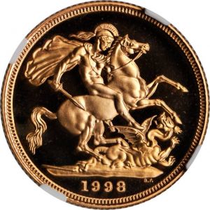 This specimen was lot 20451 in Ponterio sale 176 (Chicago, August 2013), where it sold for $646. The catalog description[1] noted, "GREAT BRITAIN. Elizabeth II, 1952-Present. Sovereign, 1998. NGC PF-69 ULTRA CAMEO. Mature head right by Broadley. Rv. Pistrucci’s St. George and the Dragon. Just about perfect! Ex: Royal Mint, 1998." This type, struck 1998-2008, features the fourth bust to be used on the sovereigns of Elizabeth II. These were sold to investors and collectors and not issued for circulation.