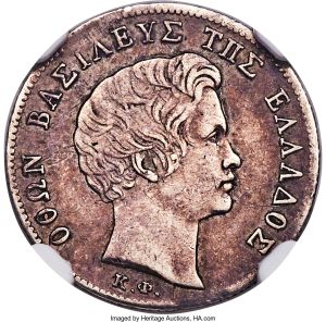 This specimen was lot 31800 in Heritage sale 3067 (Long Beach, September 2018), where it sold for $1,320. The catalog description[1] noted, "Greece: Othon 1/4 Drachma 1845 XF Details (Reverse Scratched) NGC. A handsome slate-gray representative from this short-lived series that features dark accents around the devices and a small die cud to the left of the date. From the Collection of a Philhellene." This is a rare date of a type struck 1833-34 and 1845-46.