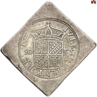 "NIEDERLANDE, GRONINGEN, Stadt. Einseitige Talerklippe zu 50 Stübern 1672, geprägt während der Belagerung durch kölnische und münstersche Truppen unter dem Befehl des münsterschen Bischofs Christoph Bernhard von Galen. Großer Stempel. Gekröntes, vierfeldiges Wappen, zu den Seiten geteilte Wertangabe 50 - ST. Sehr schön. Aus der Sammlung Eberhard Link. Exemplar der Auktion Kölner Münzkabinett 59, Köln 1993, Nr. 1176. (Netherlands, city of Groningen, uniface klippe thaler of fifty stuivers of 1672, struck while besieged by soldiers of Cologne and Munster during the Bishop's War. Obverse: large crowned arms divide the value. Very fine.)"