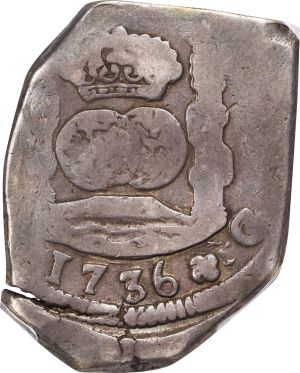 This specimen was lot 74444 in Stack's Bowers Collectors Choice sale (Costa Mesa, CA, October 2025), where it sold for $1,080. The catalog description[1] noted, "GUATEMALA. Cob 8 Reales, 1736-G J. Guatemala Mint. Philip V. PCGS FINE-15. A circulated example that still displays a bold four-digit date, which combined with its unpierced preservation make it a desirable example of the type. Some planchet flaws noted at the lower rims. From the Richard August Collection." 1733 was the first year the Guatemala mint struck coinage, having first applied for authorization from the Spanish crown in 1714. The machinery was brought from Mexico City and had already seen much service. In addition, in Guatemala there were few skilled workers, making production of milled coins equivalent to those being produced at Mexico City not feasible[2]. The endeavor was abandoned shortly thereafter and the mint began striking coins on irregular planchets without applying edge devices.