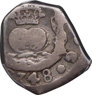 The first specimen was lot 660 in Sedwick Treasure Auction 28 (Winter Park, FL, November 2020), where it sold for $570. The catalog description[1] noted, "Guatemala, cob 2 reales, 1748J. Choice specimen with no hole (rare thus) and attractive toning, with nearly full date below pillars-crowned globes-waves, the other side off-center but with full shield and crown and assayer J just inside visible king's ordinal VI, VF for the type." This type was struck 1747-53 on dies intended for pillar coinage but, as the mint lacked machinery to cut round planchets, the coins were struck on cob planchets instead. Some effort was made to center them properly, and most have legible dates and mintmarks. The second specimen was lot 74492 in Stack's Bowers Collectors Choice sale (Costa Mesa, CA, October 2025), where it sold for $360. The catalog description[2] noted, "GUATEMALA. Cob 2 Reales, 1748-G J. Guatemala Mint. Ferdinand VI. PCGS FINE-12. From the Richard August Collection."