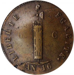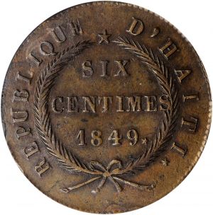 This specimen was lot 45032 in Stack's Bowers ANA sale (Costa Mesa, CA, August 2021), where it sold for $192. The catalog description[1] noted, "HAITI. 6 Centimes, AN 46 / 1849. Faustin I. PCGS VF-30. A well struck coin on an uneven flan, with medium brown patina and a small planchet flaw at the obverse rim at 7 [o'clock]." In 1803, native forces made good their rebellion against French rule, marking the first successful slave rebellion in the Western hemisphere. Turmoil did not cease with independence as the United States withheld its recognition and various factions contended for power. This type was struck 1849 only and is cheap up thru Fine condition. No locally struck Haitian coin is readily available in nice condition.