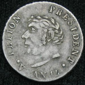 This type was struck one year only for the Western Republic of Haiti, which was one of the autonomous fragments of Haiti after securing independence from France in 1804. The coin is dated L'An 14 (year 14, or 1817 AD), following the example presented by the French Revolution for dating coins from the year of independence. The second specimen was lot 1527 in Sedwick Treasure Auction 21 (Winter Park, FL, May 2017), where it sold for $356.03. The catalog description[1] noted, "Haiti, 25 centimes, AN 14 (1817), Petion (small head), encapsulated NGC MS 63. Muted luster, with faint golden toning, slightly grainy texture, matches photo for KM-15.2 but without P below bust." Note the variation in busts between the two specimens.