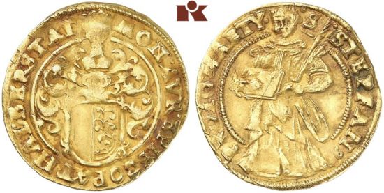 "Halberstadt, BISTUM Domkapitel. Goldgulden o. J. (um 1614). GOLD. Von großer Seltenheit. Sehr schön. (bishopric of Halberstadt, undated goldgulden, very rare, very fine.)"