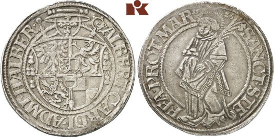 "Halberstadt, BISTUM Albrecht V. von Brandenburg, 1513-1545. Taler 1526. Variante mit vertauschten Mittelschilden von Halberstadt und Magdeburg. Von großer Seltenheit. Sehr schön Exemplar der Auktion Westfälische Auktionsgesellschaft 38, Dortmund 2006, Nr. 46. (bishopric of Halberstadt, Albrecht of Brandenburg, 1513-45, thaler of 1526, with the arms of Halberstadt and Magdeburg reversed. Of the greatest rarity, very handsome example, very fine.)"