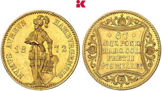 "DEUTSCHE MÜNZEN UND MEDAILLEN · HAMBURG, STADT Dukat 1872. Slg. Vogel (Auktion Künker 213) 4815. GOLD. Winz. Randfehler, fast vorzüglich. Aus der Familiensammlung Mohr. (Germany, city of Hamburg, ducat of 1872. Minor edge defect, about extremely fine.)"