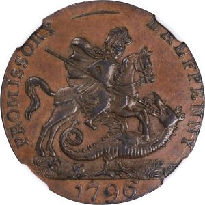 This specimen was lot 32498 in Stack's Bowers Collector's Choice sale (Costa Mesa, CA, May 2024), where it sold for $145. The catalog description[1] noted, "GREAT BRITAIN. Trade Tokens. Hampshire. Portsea. Copper 1/2 Penny Token, 1796. NGC AU-58 Brown. Obverse: St. George on horseback slaying dragon; Reverse: Ship above fish. Edge: PAYABLE AT S. SALMON S. COURTNEY & E. FROST PORTSEA. A charming chocolate-brown piece with glossy luster in the fields." Portsea is the island on which the city of Portsmouth is sited.