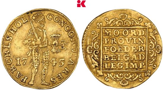"EUROPÄISCHE MÜNZEN UND MEDAILLEN · NIEDERLANDE, HOLLAND Provinz. Dukat 1745. GOLD. Min. gewellt, sehr schön-vorzüglich. (Netherlands, province of Holland, ducat of 1745. Slightly wavy, very fine to extremely fine.)"