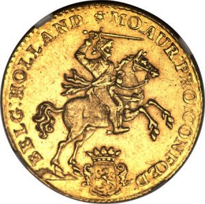 This specimen was lot 25191 in Heritage sale 3019 (Chicago, April 2012), where it sold for $1,104. The catalog description[1] noted, "Holland. Gold 14 Gulden 1751, XF45 NGC, bold details with considerable mint luster." This type is recorded for 1749-51, 1761-63 only and is not common.