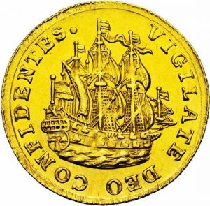 This six stuivers or "ship shilling" was struck in the Dutch provinces throughout the eighteenth century. The regular silver issue ended in Holland in 1767 but continued in gold until 1794, being struck on double ducat blanks.