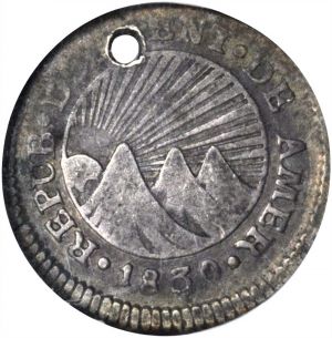 Upon separating from the Empire of Mexico in 1823, Honduras joined the Central American Republic (1823-1839). The earliest independent coinage was of a provisional nature, lasting two years. This specimen was lot 21084 in Stack's Bowers 2018 NYINC sale (New York, January 2018), where it sold for $2,400. The catalog description[1] noted, "HONDURAS. 1/2 Real, 1830-TF. NGC Fine Details--Holed. EXTREMELY RARE one year issue from this mint. The Krause book states that there are 3-4 examples known. A handsome piece despite the noted defect of having a hole. Deeply toned with most of the major design features visible without the aid of magnification. Sure to excite the connoisseur of Honduran or Central American Republic coinage." Half reales from Guatemala and Costa Rica are known.