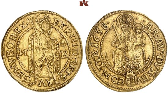 "RÖMISCH-DEUTSCHES REICH, Ferdinand III. 1625-1637-1657. Dukat 1638, NB, Nagybánya. GOLD. Von großer Seltenheit. Kl. Randfehler, sehr schön. (Holy Roman Empire, Ferdinand III, 1637-57, ducat of 1638, Nagybánya mint. Extremely rare, minor edge flaws, very fine.)"