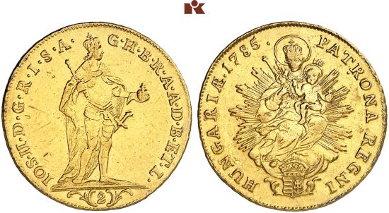 "RÖMISCH-DEUTSCHES REICH, Josef II. 1765-1790. 2 Dukaten 1785, Kremnitz. GOLD. Fassungsspuren, berieben, sehr schön. (Holy Roman Empire, Joseph II, 1765-90, double ducat of 1785, Kremnitz mint. Tool marks, polished, very fine.)"