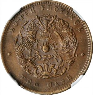 Hupeh Province is located in east-central China. The mint was active from the early Manchu dynasty, and adapted for modern coin mintage in 1895. Altho the regime decreed the striking of one, five, ten and twenty cash in copper, the vast majority produced were ten cash. This specimen was lot 55179 in Stack's Bowers Hong Kong auction (Hong Kong, April 2021), where it sold for $216. The catalog description[1] noted, "CHINA. Hupeh. 10 Cash, ND (1902-05). NGC MS-63 Brown. Water Dragon variety, with claw inside whiskers. A boldly struck and softly lustrous coin with even dark brown patina, great overall eye appeal for the type." On this variety, the water dragon is shown flying over a mountain.