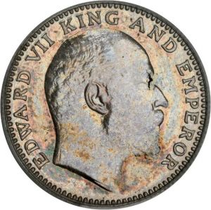 This specimen was lot 1418 in Ponterio sale 173 (New York, January 2013), where it sold for $2,232. The catalog description[1] noted, "INDIA. 1/2 Rupee, 1910. Bombay Mint. PCGS PROOF-65. Dark attractive multicolor toning. Ex: Sanjay Gandhi." The half rupees of Edward VII were struck 1904-10 and most dates are common. Proofs are rare. The Calcutta mint contributed another 3,413,000.