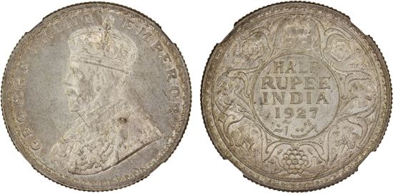 This specimen was lot 625 in Stephen Album sale 50 (Santa Rosa, CA, September 2024), where it sold for $204. The catalog description[1] noted, "BRITISH INDIA: George V, 1910-1936, AR 1/2 rupee, 1927(c), NGC graded MS64." The half rupee was never minted in the immense numbers of the George V rupees but it is not rare, being struck steadily 1912-30, 1933-36. The minting of rupees effectively ceased after 1922. The Bombay mint struck no half rupees in 1927.
