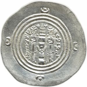 The Arabs overran the Sasanian Empire in the 650’s and established Islamic dominance over most of the territory. The Arab capital at the time was Medina, but the caliph (Umar I) left most of the local governments to manage as before, asking only allegiance to the new order. As a result, Persian coinage continued much as before, despite the Muslim prohibition against ‘graven images’. Initially, issues were anonymous, but eventually identified Umayyad governors. After the coinage reform of ‘Abd al-Malik I in 685 AD, the Sasanian imitations ceased and subsequent Islamic issues possessed only script.