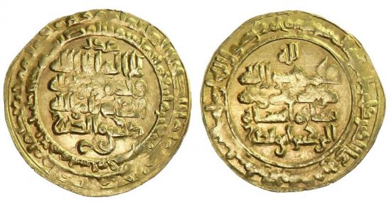 The specimen shown was lot 420 in Steve Album sale 16 (Santa Rosa, CA, May 2013), where it sold for US$360. The catalog description reads[1]: "BUWAYHID: Khusrafiruz, 1048-1055, AV dinar, al-Ahwaz, AH445, nice strike, minor weakness in the centers, ruler's name given as shahanshah al-rahim abu nasr, nearly EF, R."