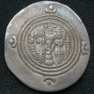 The specimen shown is a silver drachm of Khurso II. This ruler spent much of his reign leading the Sasanian army on a number of offensive and defensive military operations. The vast number of drachms produced during his rule are probably representative of the large payments made to his armed forces. It is thought that he brought mobile mints with him to keep up with the demand. This coin was struck at NYH (Nemavand).