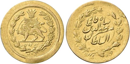This undated type is not listed in the SCWC. The auctioneers referenced it to KM 922, which is an issue of Nasir al-Din. It accompanied gold half, one, five and ten toman. This denomination was normally struck in silver (KM 973 or KM 974).