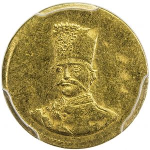 This specimen was lot 833 in Stephen Album sale 30 (Santa Rosa, CA, January 2018), where it sold for $152.75. The catalog description[1] noted, "IRAN: Nasir al-Din Shah, 1848-1896, AV 2000 dinars, Tehran, AH1300, scarce date, PCGS graded AU55, R." The Qajars were a group of Turkic origin who lived in the area of Azerbaijan. They were sympathetic to the Safavids, who ruled in Persia from 1501-1736 AD. The Qajar Dynasty began when Mohammad Khan Qajar seized Mashhad (then under Durrani suzerainty – see Afghanistan) and put an end to the Afsharid Dynasty. The Qajars were forced to fight several defensive wars against Russia, losing territory each time. Foreign powers became more involved in Persia as the strategic nature of the region became clear. The empire was nearly bankrupt by the end of the 1800’s, and the dynasty finally fell when Reza Khan, a commander of the Persian Cossack Brigade, led a coup d’etat and launched the Pahlavi Dynasty in 1925 AD. This tiny gold coin is listed for AH 1297-1301; this denomination was also struck in silver.