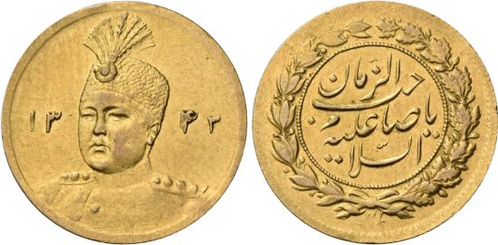 The first specimen was lot 846 in Stephen Album sale 30 (Santa Rosa, CA, January 2018), where it sold for $176.25. The catalog description[1] noted, "IRAN: Ahmad Shah, 1909-1925, AV 5000 dinars, AH1343/33, PCGS graded AU." The second specimen was lot 415 in Goldberg sale 136 (Los Angeles, September 2023), where it sold for $348. The catalog description[2] noted, "Iran. 5000 Dinars (½ Toman), AH1343 (1925). Sultan Ahmad Shah, 1909-1925. PCGS graded AU-58." The third specimen was lot 125 in Sincona sale 92 (Zürich, October 2024), where it did not sell. The catalog description[3] noted,