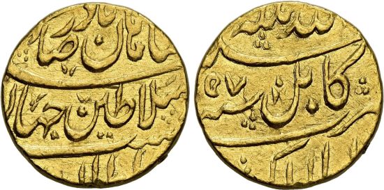 This type was struck AH 1157 and 1160 at Kabul in Afghanistan. Nader Shah was a conqueror in the old style of Tamburlaine but even he could not hold Afghanistan for long. Ashrafis of this style were also struck in Bahkar, Derajat and Peshawar.