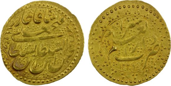 This specimen was lot 564 in Stephen Album sale 47 (Santa Rosa, CA, September 2023), where it sold for $312. The catalog description[1] noted, "QAJAR: Fath 'Ali Shah, 1797-1834, AV toman, Shiraz, AH1229, type V, slightly weak central strike, EF, R." The Qajars were a group of Turkic origin who lived in the area of Azerbaijan. They were sympathetic to the Safavids, who ruled in Persia from 1501-1736 AD. The Qajar Dynasty began when Mohammad Khan Qajar seized Mashhad (then under Durrani suzerainty – see Afghanistan) and put an end to the Afsharid Dynasty. The Qajars were forced to fight several defensive wars against Russia, losing territory each time. Debasement was the inevitable result. The type V standard (1 toman = 4.80 g) seems to have been used AH 1227-1231 only. The SCWC notes tomans were struck to this standard at Isfahan, Kashan, mashhad, Mazandaran, Rasht, Shiraz, Tehran and Yazd with a few half tomans.