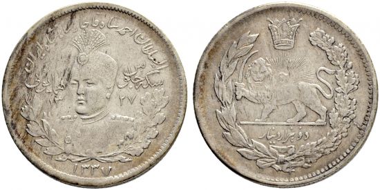 "IRAN | Qajar Dynasty | Ahmad Shâh, 1327-1344 H./1909-1925 AD, Silver coinage. 2 Qiran 1337 H. On the 10th anniversary of enthronement. Bust half left between the words sikke-yi julûs-i - humâyûnî 10 / 13 - 27 on branches, name and title above, the date below, rev. lion and sun above value in wreath. Very fine."
