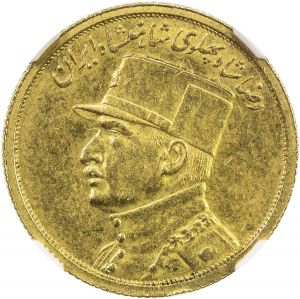 This specimen was lot 1357 in Stephen Album sale 38 (Santa Rosa, CA, September 2020), where it sold for $1,428. The catalog description[1] noted, "IRAN: Reza Shah, 1925-1941, AV ½ pahlavi, SH1312, mintage of only 892 pieces, NGC graded AU58, R." The pahlavi, named after the family of the dynasty's founder, Reza Shah, was first struck in 1926 (KM 111) but the first issues were only 1.92 g. In 1931 the system was reformed and the new pahlavi matched the British sovereign in gold content. This rare type was struck 1931-36.