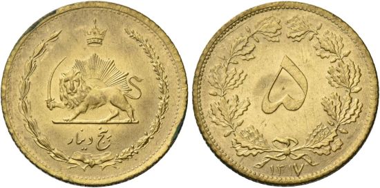 In SH 1310, a new mint was built in Tehran and German equipment installed and new denominations introduced. The pahlavi was raised in weight to match the British sovereign. This type was struck SH 1315-1321 and is common.