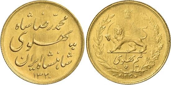 Reza Shah was an outspoken admirer of Adolf Hitler and when that became unacceptable to the Allies in 1941, they invaded. Reza Shah abdicated in favor of his son, Mohammed Reza Shah. This type, which matched the British half sovereign, was struck SH 1320-1323. The first two dates are scarce.