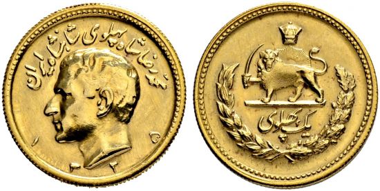 "IRAN | Pahlavi Dynasty | Muhammad Rezâ Shâh, 1320-1358 ShH./1941-1979 AD, Gold coinage. 1 Pahlavi 1325 ShH/1946 AD. Head to left with name and title above, date below, rev. crowned lion and sun above value in wreath, high relief head. About uncirculated."